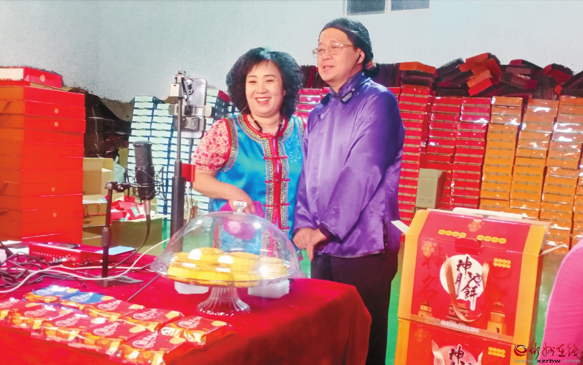 二人臺演員池銀壽直播銷售神池月餅和麻花。 鄭志東攝