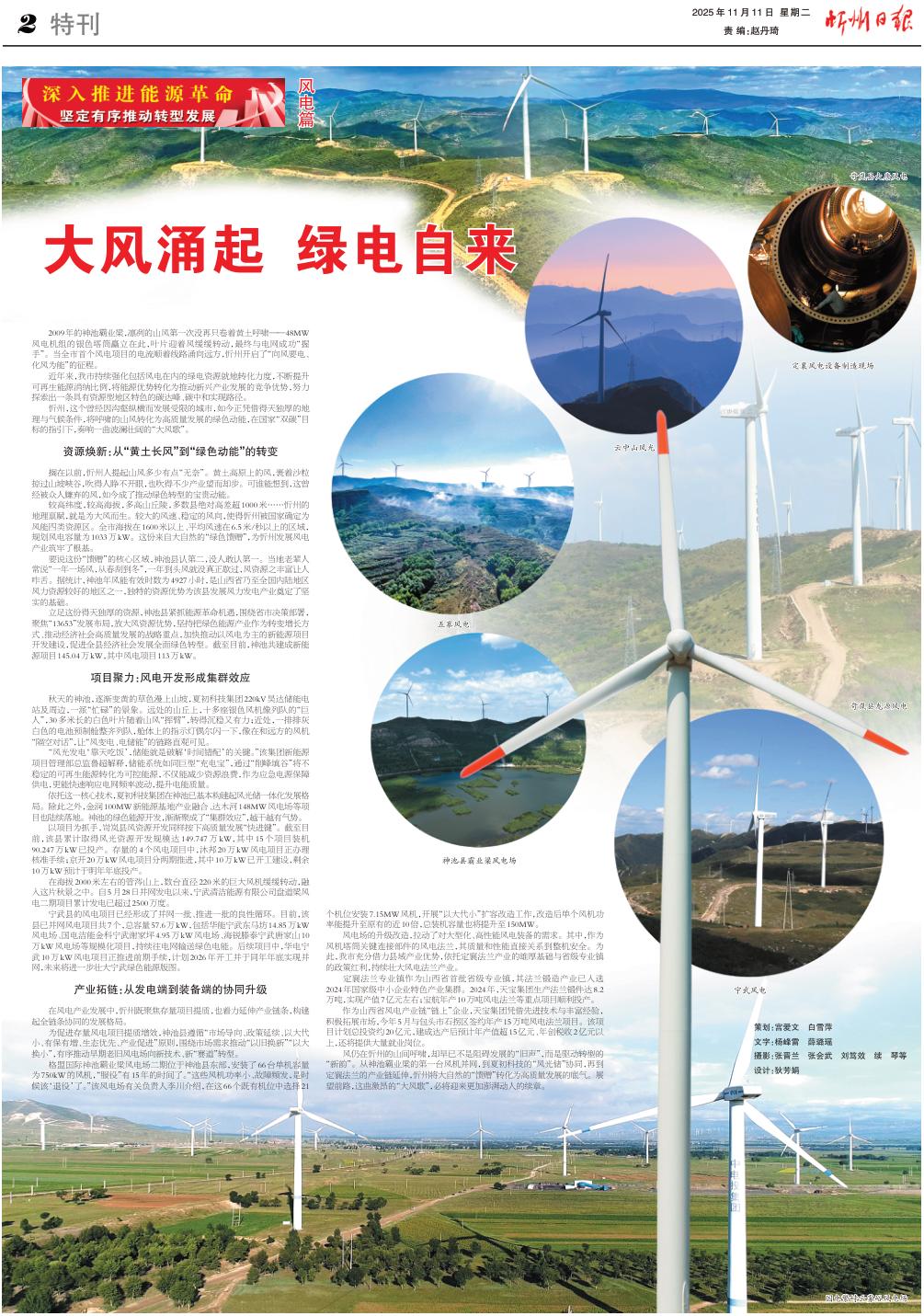 寧武縣的風(fēng)電項(xiàng)目已經(jīng)形成了并網(wǎng)一批、推進(jìn)一批的良性循環(huán)。目前,該縣已并網(wǎng)風(fēng)電項(xiàng)目共7個(gè),總?cè)萘?7.6萬(wàn)kW,包括華能寧武東馬坊14.85萬(wàn)kW風(fēng)電場(chǎng)、國(guó)電潔能金科寧武謝家坪4.95萬(wàn)kW風(fēng)電場(chǎng)、海銳滕泰寧武唐家山10萬(wàn)kW風(fēng)電場(chǎng)等規(guī)模化項(xiàng)目,持續(xù)往電網(wǎng)輸送綠色電能。后續(xù)項(xiàng)目中,華電寧武10萬(wàn)kW風(fēng)電項(xiàng)目正推進(jìn)前期手續(xù),計(jì)劃2026年開(kāi)工并于同年年底實(shí)現(xiàn)并網(wǎng),未來(lái)將進(jìn)一步壯大寧武綠色能源版圖。