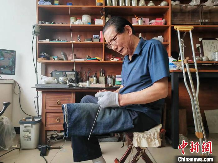 王圣良告訴記者,小時候他因為生病,腿腳落下了殘疾,別的兄弟姐妹出去玩,他就跟著爺爺學習錫雕。“做錫雕需要心靜、身靜,因為行走不方便,我比其他人更坐得住,在學習錫雕上更有‘優(yōu)勢’”。