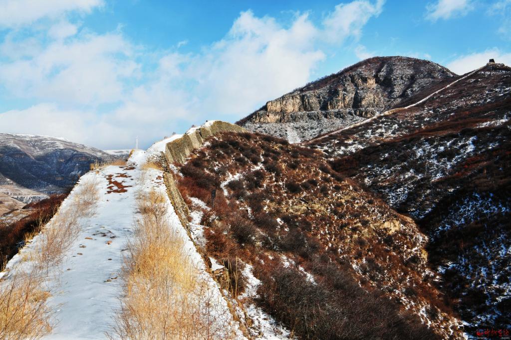 另一道長城是這樣的:史書上記載的宋長城出發(fā)地是草城川口天澗堡,實地中的草城川現(xiàn)在叫北川河,天澗堡古代可能有堡墻,如沒有,不可能有“川口有古城”的記載,可能歷經(jīng)千余年風(fēng)雨被河水沖刷掉了,現(xiàn)在堡墻已不太明顯但有古文化層遺跡,還有兩座規(guī)模較大的烽火臺。長城從此出發(fā),向東爬上陡坡,順著一道山洼上到山頂。在山頂走了一公里余就與從興縣西來的北齊、隋修筑的早期長城匯合,在陡峭的山頂上形成一個完美的“岢嵐結(jié)”,也就是俗話中的“二把叉”形狀。這段宋代獨(dú)立修筑的長城大約有3公里。