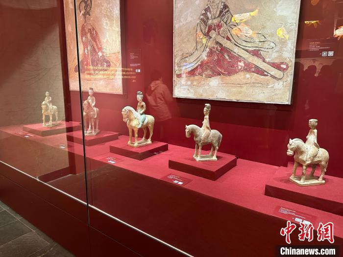 唐墓中的壁畫和彩色陶俑是唐代極具代表性的藝術(shù)珍品。記者在展廳看到,女性陶俑類型多樣,各種女坐俑、立俑、侍俑、樂舞俑、騎馬俑、貴婦俑……這些女俑造型生動(dòng),尤其是三彩女俑,釉色艷麗,呈現(xiàn)了唐代女性“千人千面”的生存狀態(tài)。