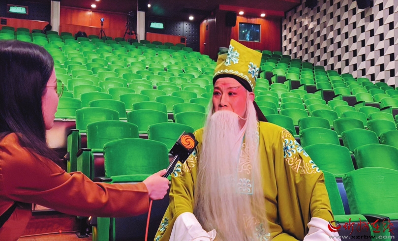 演出現(xiàn)場,演員楊仲義接受媒體采訪。