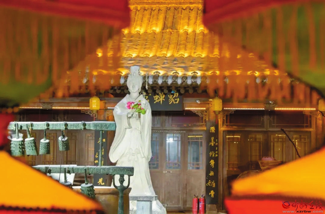 現(xiàn)在的貂蟬陵園是在墓地原址重新筑砌的,坐北朝南,門檐上懸“貂蟬陵園”橫匾,兩側(cè)有“閉月羞花堪為中國驕傲,忍辱步險實令須眉仰止”的金文楹聯(lián)。園內(nèi)用花墻分隔成南、北兩部分,北為陵區(qū),南為展區(qū)。南院建貂蟬彩塑館,再現(xiàn)“貂蟬迎賓”“羞花問世”“祭山驚艷”“落難認父”“拜月銘志”“憂國請纓”“施計除奸”“繡袍寄情”等場面,反映了貂蟬“不惜萬金軀,何懼險象生”的一生。