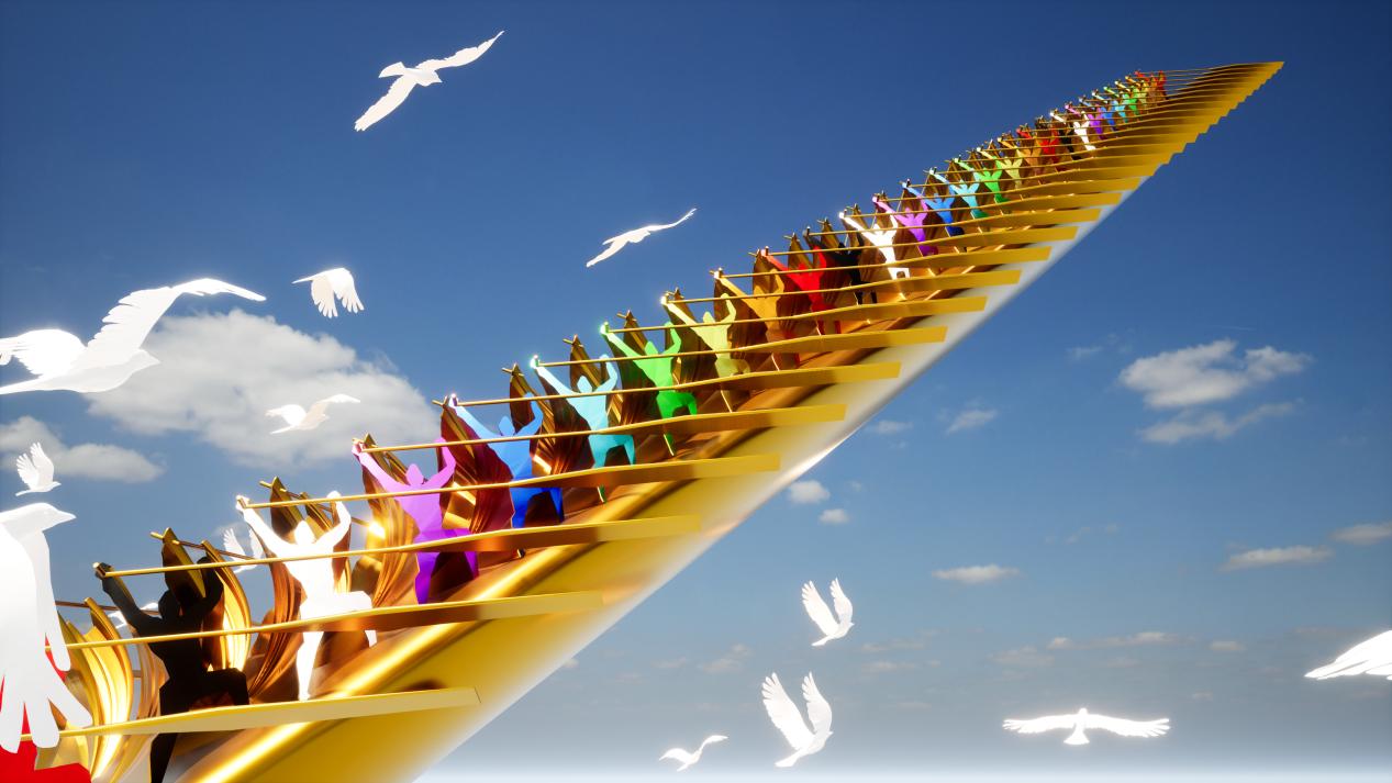 作品承載著長征精神、延安精神在內(nèi)的紅色革命精神、抗疫精神,以及世界和平文化,將舟作為人類文明的象征,人類獲救的符號,連接此岸與彼岸,連接文明與荒蠻,連接廣袤的宇宙,載來文明,送來曙光,舟行七千年歷史,厚載五千年文化的深層意義突顯出來,它載著億萬人民的偉大夢想駛向民族復(fù)興的光輝彼岸,將中華民族與世界人民同舟共濟(jì)、拼搏奮進(jìn)、乘風(fēng)破浪的壯麗史詩寫在浩瀚無垠的太空與人類文明史上,藝術(shù)化的表達(dá)了對人類命運共同體理念的追求。