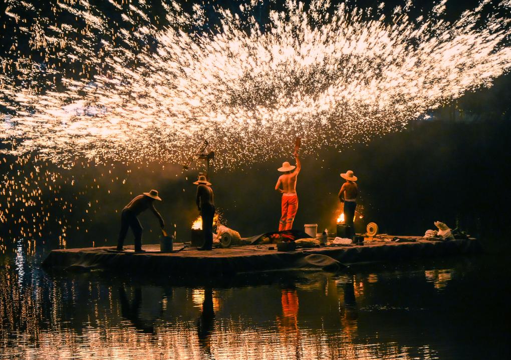這是9月16日在安徽省宿州市碭山縣梨小萌歡樂梨園景區(qū)拍攝的打鐵花表演。新華社發(fā)(崔猛 攝)