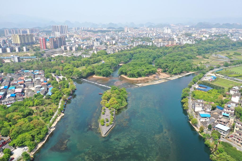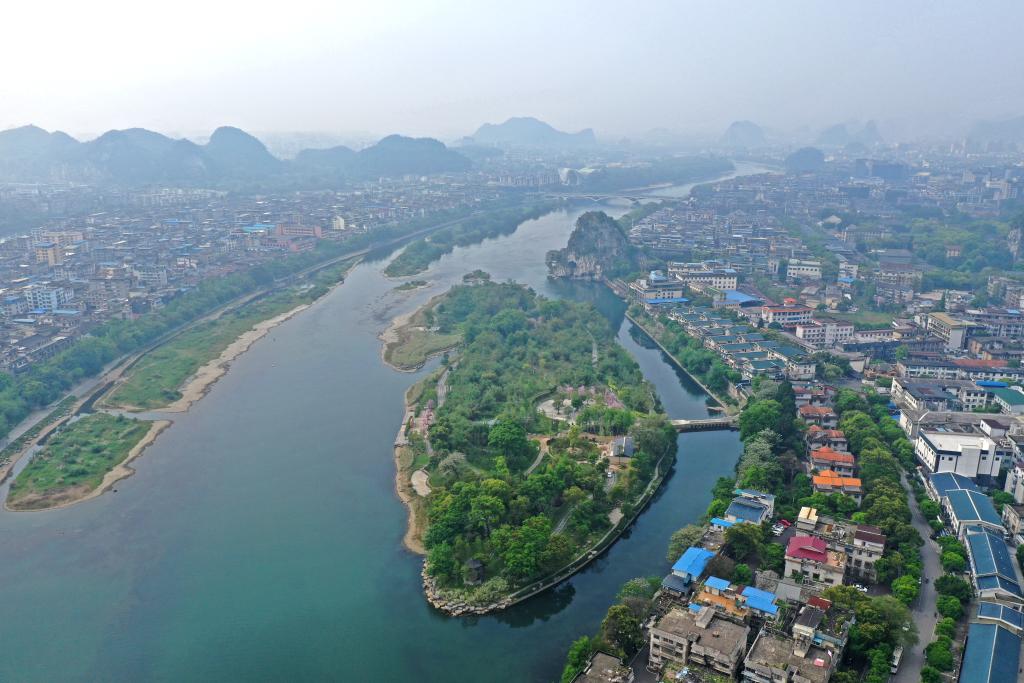 生態(tài)修復改造后的漓江伏龍洲景色(無人機照片)。新華社記者 周華 攝