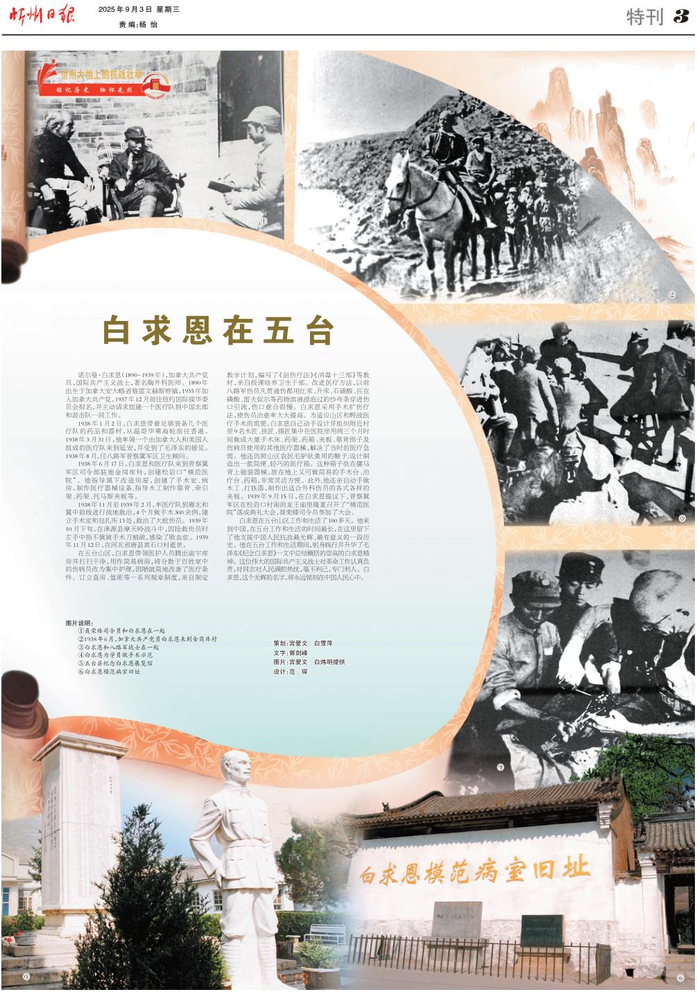 白求恩在五臺(tái)山區(qū)工作和生活了100多天。他來(lái)到中國(guó),在五臺(tái)工作和生活的時(shí)間最長(zhǎng),在這里留下了他支援中國(guó)人民抗戰(zhàn)最光輝、最有意義的一段歷史。他在五臺(tái)工作和生活期間,躬身踐行并升華了毛澤東《紀(jì)念白求恩》一文中總結(jié)概括的崇高的白求恩精神。這位偉大的國(guó)際共產(chǎn)主義戰(zhàn)士對(duì)革命工作認(rèn)真負(fù)責(zé),對(duì)同志對(duì)人民滿腔熱忱,毫不利己,專門利人。白求恩,這個(gè)光輝的名字,將永遠(yuǎn)銘刻在中國(guó)人民心中。
