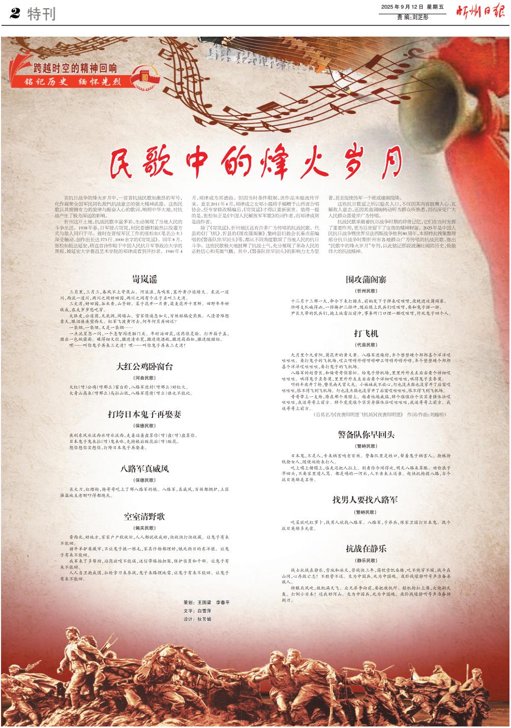 抗戰(zhàn)民歌承載著抗日戰(zhàn)爭(zhēng)時(shí)期的珍貴記憶,它們?cè)诋?dāng)時(shí)發(fā)揮了重要作用,更為后世留下了寶貴的精神財(cái)富。2025年是中國(guó)人民抗日戰(zhàn)爭(zhēng)暨世界反法西斯戰(zhàn)爭(zhēng)勝利80周年,本報(bào)特此搜集整理部分抗日戰(zhàn)爭(zhēng)時(shí)期忻州市各地群眾廣為傳唱的抗戰(zhàn)民歌,推出“民歌中的烽火歲月”??源算懹浤嵌尾憠验煹臍v史,致敬偉大的抗戰(zhàn)精神。