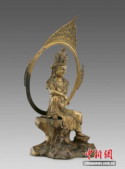 中新網(wǎng)金華9月17日電(董易鑫 孫媛媛)高53厘米,整尊觀音頭戴高冠,冠上飾化佛,身佩瓔珞,左臂撐巖,右臂置膝,左腿下垂,右腿上曲足踏巖石,安坐于山巖之上,身旁石上置一凈瓶,身后一圓輪狀大背光,渾圓精美,邊緣裝飾火焰紋,仿佛巖前有潺潺流水,觀音目觀水中月影——這是68年前出土于浙江金華萬佛塔地宮的五代鎏金銅觀音造像,也叫作“水月觀音”,是國家一級文物,現(xiàn)藏于中國國家博物館。