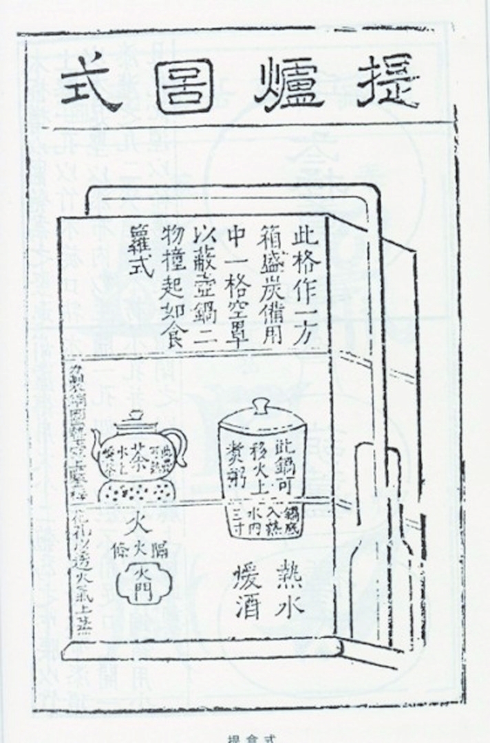 明代戲曲家高濂編撰的《遵生八箋》,可謂士大夫精致生活的指導(dǎo)書(shū),書(shū)中仔細(xì)介紹了提爐的形制與結(jié)構(gòu),還附上了插圖。書(shū)云:“式如提盒,亦余制也。高一尺八寸,闊一尺,長(zhǎng)一尺二寸,作三撞。下層一格,如方匣,內(nèi)用銅造水火爐,身如匣方,坐嵌匣內(nèi)。中分二孔,左孔炷火,置茶壺以供茶;右孔注湯,置一桶子小鑊有蓋,頓湯中煮酒。長(zhǎng)日午余,此鑊可煮粥供客。傍鑿一小孔,出灰進(jìn)風(fēng)。其壺鑊迥出爐格上,太露不雅,外作如下格方匣一格,但不用底以罩之,便壺鑊不外見(jiàn)也。一虛一實(shí)共二格,上加一格,置底蓋以裝炭,總?cè)癯梢患?,上可箾關(guān),與提盒作一副也?!?/p>