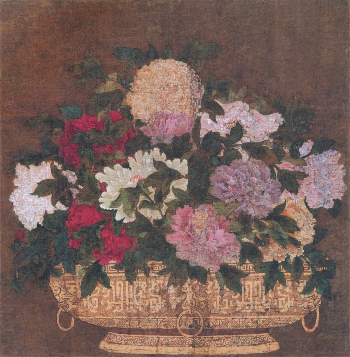 日本知恩院藏有一幅宋代《牡丹圖》,畫上共12朵盛放的牡丹,尺寸超大,花色各異。盛花器皿是一只類似簋的金色青銅器,器形圓滿端莊,紋飾線條飽滿,連拉環(huán)都被畫成滿圓,材質(zhì)似為青銅,也可能是金?;ǘ洳宸排c花器呈“品”字偏圓形布局。細(xì)密的絹絲雖已襤褸,但其靜穆而雍容華貴的氣質(zhì)仍令人震撼——它是傳世牡丹圖中最令人印象深刻的一幅。