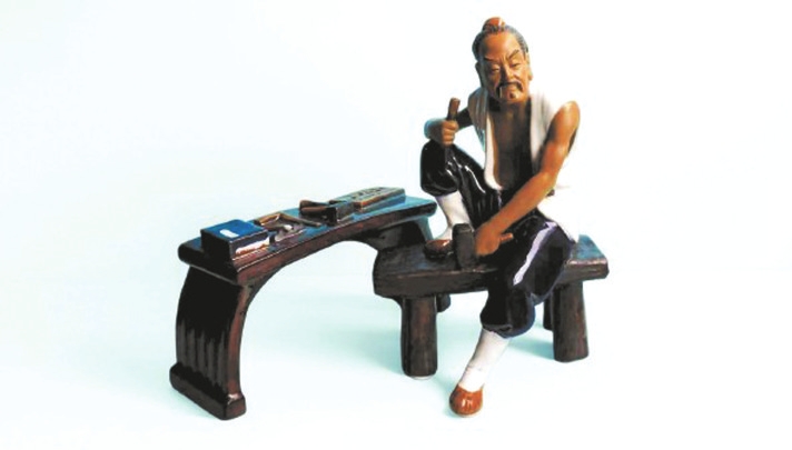 塑像高22厘米、長14厘米、寬13厘米,魯班右手持鑿、左手緊握鐵錘,雙目炯炯,仿佛正凝神思索,即將開啟一場巧奪天工的創(chuàng)作;身旁的工作臺長19.7厘米、寬6.5厘米、高10厘米,上面整齊擺放著曲尺、錘子、鑿子等工具。作品靈感源自春秋時(shí)期這位傳奇工匠的故事,以陶塑藝術(shù)為載體,栩栩如生地呈現(xiàn)出魯班的形象,讓歷史底蘊(yùn)與藝術(shù)魅力交融出獨(dú)特的韻味。