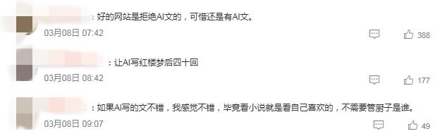 有報道稱,社交媒體上的AI寫作暴富噱頭,讓網(wǎng)文圈變了天。有網(wǎng)文作家坦言,自己日更近萬字已是極限,但在AI幾分鐘幾萬字面前,直接被降維打擊。評論區(qū)里,網(wǎng)友議論紛紛,“AI寫的文章空洞乏味,沒有個人感情”“有一本AI文火的嗎”……