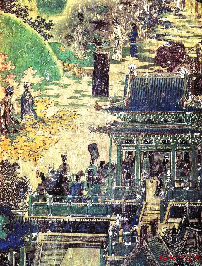 畫面中,有頭戴冠冕、身著長袍的王子,焚香祈禱的王后;有嬉戲玩耍的兒童,酒樓市井里的說唱賣藝者;還有撐傘的、捧鳥籠的凡夫俗子,儼然一幅幅生動的古代宮廷生活圖、古代市井圖。豪華宮殿、樓閣、古塔、作坊、民居各類建筑應(yīng)有盡有,無不體現(xiàn)出畫師高超的技藝。