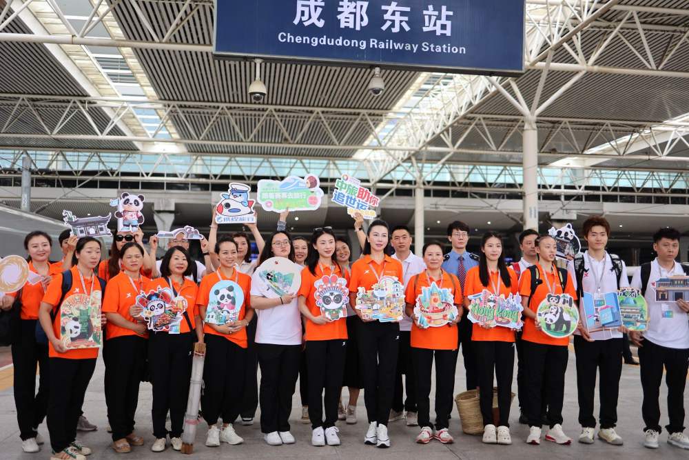 8月6日,嘉賓們?cè)诔啥紪|站站臺(tái)上合影。新華社發(fā)(呂國(guó)應(yīng) 攝)