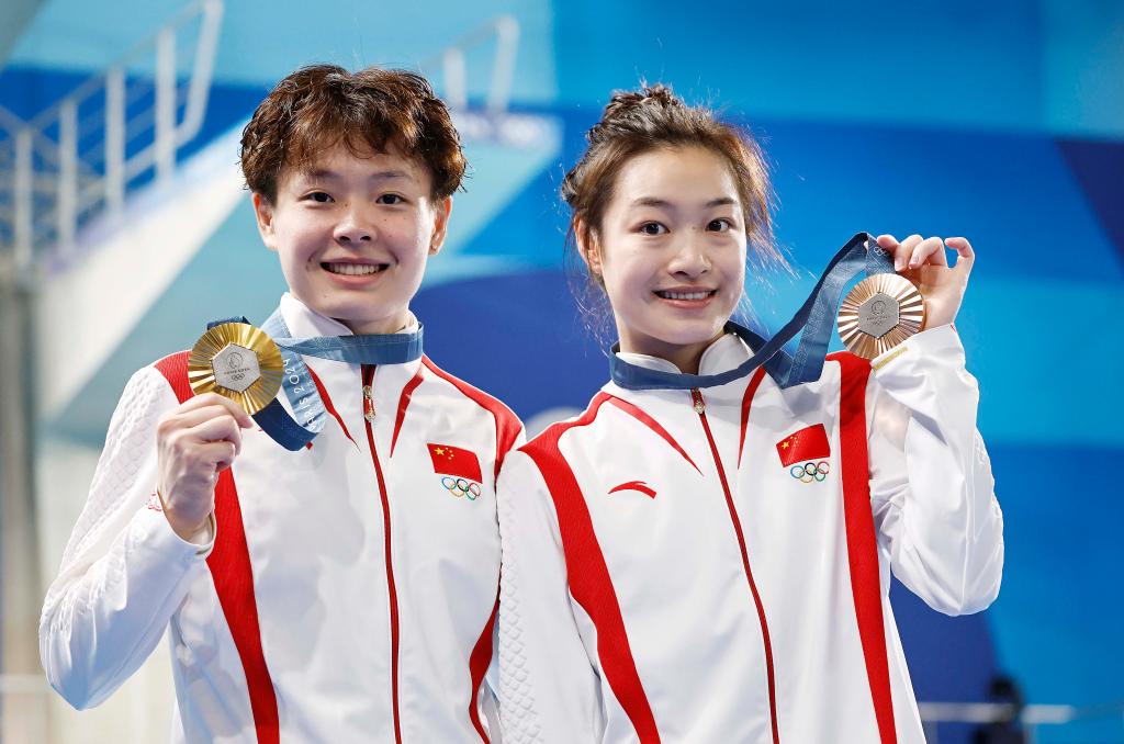 8月9日,冠軍中國選手陳藝文(左)、季軍中國選手昌雅妮在頒獎儀式后。新華社記者 張玉薇 攝