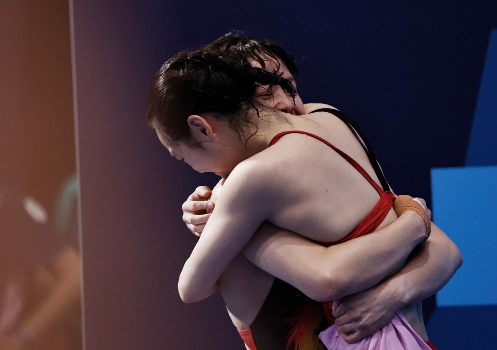 8月9日,陳藝文、昌雅妮在比賽后擁抱。新華社記者 張玉薇 攝