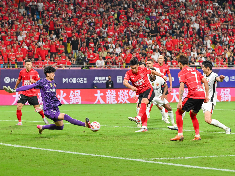8月30日,成都蓉城隊(duì)球員楊帥(左三)在比賽中射門。當(dāng)日,在四川成都進(jìn)行的中國足球超級聯(lián)賽第23輪比賽中,成都蓉城隊(duì)主場4:1戰(zhàn)勝上海海港隊(duì)。新華社記者 王曦 攝