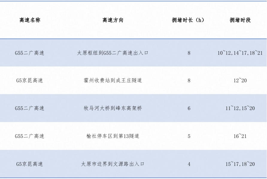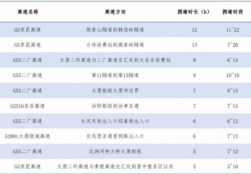 (1)擁堵可能出現(xiàn)在:G55二廣高速忻州段忻州—G2003太原繞城高速東環(huán)段松莊;G5京昆高速太祁段夏家營樞紐—羅城樞紐、G5京昆高速祁臨段明姜—霍州—平遙;G55二廣高速太長段榆社—太谷。