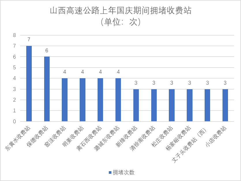 (4)流量較大收費站:G5京昆高速平陽段東黃水收費站、G1812滄榆高速忻保段保德收費站、窯洼收費站、G5京昆高速祁臨段明姜收費站、G20青銀高速汾離段離石西收費站、S2201長治繞城高速潞城東收費站。