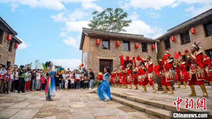 炎帝文化體驗園“古香中廟八坊三十六院”15日正式開園。開園儀式結束后,行進式演出精彩上演。游客跟隨演員的腳步,一起行走在“八坊三十六院”中。每到一處,都有神農(nóng)高蹺、舞獅表演、威風鑼鼓等各種表演。