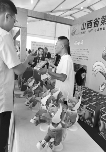 開幕式前,提前一兩個(gè)小時(shí)安檢入場(chǎng)的觀眾,遠(yuǎn)遠(yuǎn)就看到“翔翔”的召喚,紛紛在吉祥物專營(yíng)區(qū)扎堆?!?8元一個(gè),就剩30個(gè)了?!睂I(yíng)區(qū)的售賣者告訴山西晚報(bào)記者,他們也沒想到這只褐馬雞如此受歡迎,很快就要被搶沒了。大同的趙女士搶到一個(gè),她說朋友從外地剛回來不方便出門,讓她買一個(gè)留作紀(jì)念。
