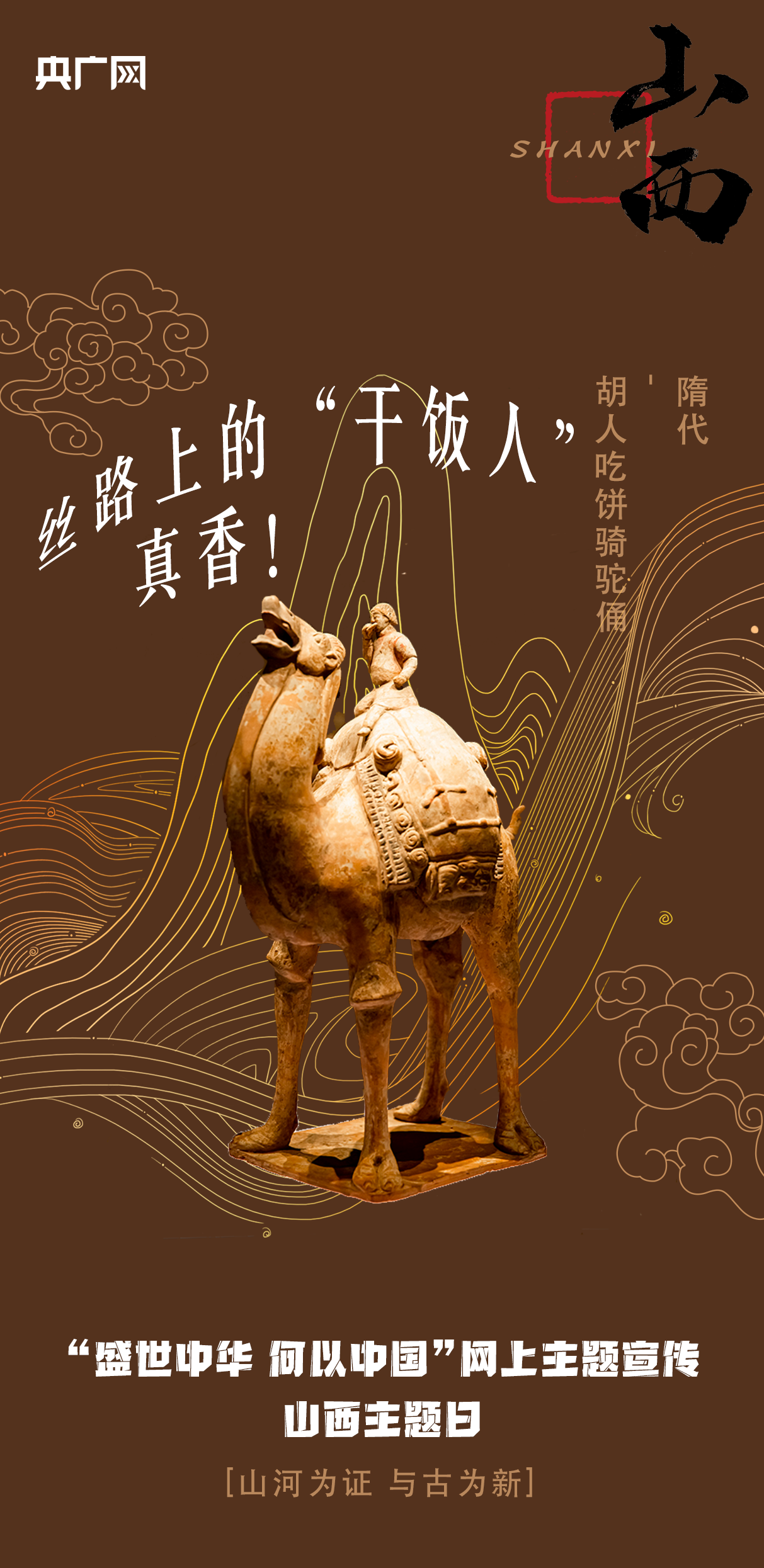 絲路漫漫,這位商人急著趕路,只能在路上匆忙“干飯”。他手里的餅子其實(shí)就是今天新疆的馕。胡人吃餅騎駝俑從一個(gè)側(cè)面反映出絲綢之路上貿(mào)易繁忙的景象。