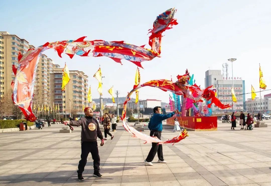 市民在襄汾縣鑼鼓廣場舞動龍綢慶祝龍年