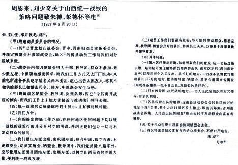 圖1 1937年9月20日,周恩來(lái)、劉少奇關(guān)于山西統(tǒng)一戰(zhàn)線的策略問題致朱德、彭德懷等電。
