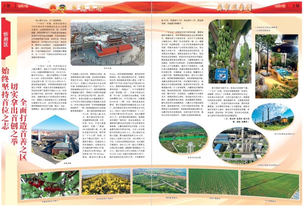 “十四五”以來,忻府區(qū)綜合實力穩(wěn)步攀升,地區(qū)生產(chǎn)總值年均增速達5.3%,總量相繼跨越200億、250億大關(guān),穩(wěn)居全市首位;一般公共預(yù)算收入年均增長4.16%,位列全市前茅;規(guī)模以上工業(yè)企業(yè)達到53家,開工億元以上項目46個,清涼灣溫泉康養(yǎng)、宏厚鋼結(jié)構(gòu)裝配式建筑生產(chǎn)線等一批重大項目相繼建成投用,帶動固定資產(chǎn)投資年均增長6.1%,經(jīng)濟運行穩(wěn)中有進、穩(wěn)中向好。轉(zhuǎn)型升級步伐加快,戰(zhàn)略性新興產(chǎn)業(yè)增加值年均增長12%,規(guī)模以上裝備制造業(yè)占工業(yè)增加值比重提升至6.6%,金宇科林認定為省級廢棄資源綜合利用產(chǎn)業(yè)鏈“鏈主”企業(yè),晨輝鍛壓、泰山石膏等企業(yè)納入省級重點產(chǎn)業(yè)鏈鏈上企業(yè)名單,資源再生利用、溫泉康養(yǎng)獲批市級專業(yè)鎮(zhèn);農(nóng)業(yè)綜合機械化率提升至85%,糧食產(chǎn)量連年保持在6.1億斤以上,區(qū)級以上農(nóng)業(yè)龍頭企業(yè)達到32家,培育綠色食品35個、有機產(chǎn)品9個、國家地理標志農(nóng)產(chǎn)品4個;成功創(chuàng)建省級全域旅游示范區(qū),持續(xù)壯大奇頓合溫泉康養(yǎng)產(chǎn)業(yè),牧馬河生態(tài)公園開園,遺山園、陀羅山、蒼龍山創(chuàng)建AAA級旅游景區(qū),云中河景區(qū)榮獲國家級文明旅游示范單位,忻州古城先后獲批“首批國家級旅游休閑街區(qū)”“第二批國家級夜間文化和旅游消費集聚區(qū)”,累計接待游客超6800萬人次,綜合收入逾18億元。城鄉(xiāng)建設(shè)協(xié)同共進,交通路網(wǎng)持續(xù)完善,太忻、忻原、忻定、忻奇大道建成通車,實施二廣高速、108國道改線工程,開工雄忻高鐵忻府區(qū)段;深學篤行“千萬工程”經(jīng)驗,打造8個精品示范村、50個提檔升級村;實施農(nóng)村人居環(huán)境整治,完善農(nóng)村生活垃圾處理中轉(zhuǎn)站157座,升級農(nóng)村電網(wǎng)980km,硬化街巷124個村453.6km,建設(shè)一般農(nóng)村公路46條93.6km。改革動能持續(xù)增強,教育改革持續(xù)深化,深入推進集團化辦學、實施校校合作;林權(quán)制度改革深入推進,開展“百場帶千村”行動,林業(yè)產(chǎn)業(yè)總產(chǎn)值達到7.56億元;營商環(huán)境持續(xù)優(yōu)化,991個依申請事項實現(xiàn)“一網(wǎng)通辦”,15個高頻事項達成“最多跑一次”;市場主體登記注冊“半日結(jié)”辦理模式全面落地,實現(xiàn)材料精簡30%、環(huán)節(jié)壓縮60%、時限縮短50%的“三降”目標。綠色底色更加鮮明,累計實施清潔取暖改造2.46萬余戶,農(nóng)作物秸稈綜合利用率穩(wěn)定在90%以上,PM2.5、PM10年均濃度比“十三五”末分別下降29.5%和24.6%,優(yōu)良天數(shù)增加41天;水環(huán)境治理持續(xù)深化,縱深推進河湖庫“清四亂”常態(tài)化規(guī)范化,定襄橋國考斷面水質(zhì)連續(xù)4年達到Ⅲ類水體標準;土壤污染防治扎實有效,2萬畝地膜實現(xiàn)科學使用回收,大宗工業(yè)固廢綜合利用率達80%以上;國土綠化行動深入實施,累計建設(shè)營造林21.04萬畝,完成人工造林10.46萬畝、封山育林7.53萬畝,生態(tài)安全屏障更加牢固。民生福祉不斷提升,88%以上的一般公共預(yù)算支出投向民生領(lǐng)域,城鎮(zhèn)累計新增就業(yè)1.76萬人,城鄉(xiāng)居民人均可支配收入年均增長5.3%、6.8%;實施鄉(xiāng)村振興項目305個,提升改造農(nóng)村幼兒園25所、義務(wù)教育學校55所、普通高中3所、職業(yè)高中1所,群眾獲得感、幸福感不斷攀升。
