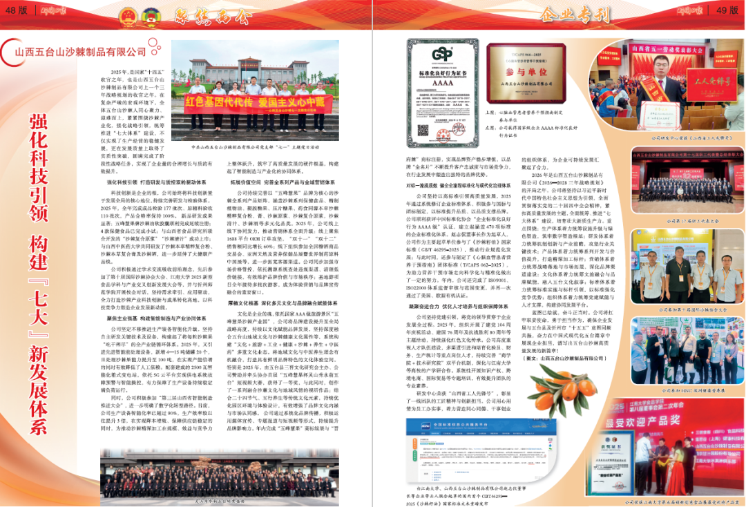 2025年,是國(guó)家“十四五”收官之年,也是山西五臺(tái)山沙棘制品有限公司上一個(gè)三年戰(zhàn)略規(guī)劃的收官之年。在復(fù)雜嚴(yán)峻的宏觀環(huán)境下,全體五臺(tái)山沙棘人同心聚力、迎難而上,緊緊圍繞沙棘產(chǎn)業(yè)化,強(qiáng)化戰(zhàn)略引領(lǐng),統(tǒng)籌推進(jìn)“七大體系”建設(shè),不僅實(shí)現(xiàn)了生產(chǎn)經(jīng)營(yíng)的穩(wěn)健發(fā)展,更在發(fā)展質(zhì)量上取得了實(shí)質(zhì)性突破,圓滿完成了階段性戰(zhàn)略任務(wù),實(shí)現(xiàn)了企業(yè)量的合理增長(zhǎng)與質(zhì)的有效提升。