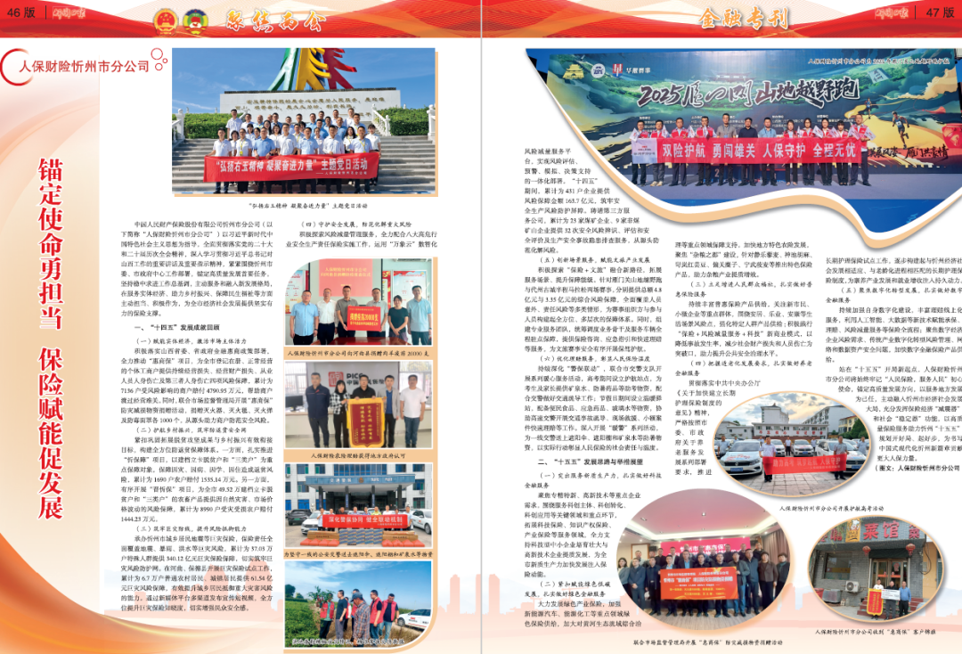 中國人民財產(chǎn)保險股份有限公司忻州市分公司(以下簡稱“人保財險忻州市分公司”)以習(xí)近平新時代中國特色社會主義思想為指導(dǎo),全面貫徹落實(shí)黨的二十大和二十屆歷次全會精神,深入學(xué)習(xí)貫徹習(xí)近平總書記對山西工作的重要講話及重要指示精神,緊緊圍繞忻州市委、市政府中心工作部署,錨定高質(zhì)量發(fā)展首要任務(wù),堅(jiān)持穩(wěn)中求進(jìn)工作總基調(diào),主動服務(wù)和融入新發(fā)展格局,在服務(wù)實(shí)體經(jīng)濟(jì)、助力鄉(xiāng)村振興、保障民生福祉等方面主動擔(dān)當(dāng)、積極作為,為全市經(jīng)濟(jì)社會發(fā)展提供堅(jiān)實(shí)有力的保險支撐。