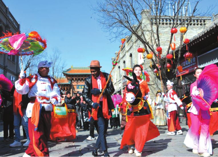 外國(guó)友人參與“跑驢”特色民俗表演活動(dòng)。